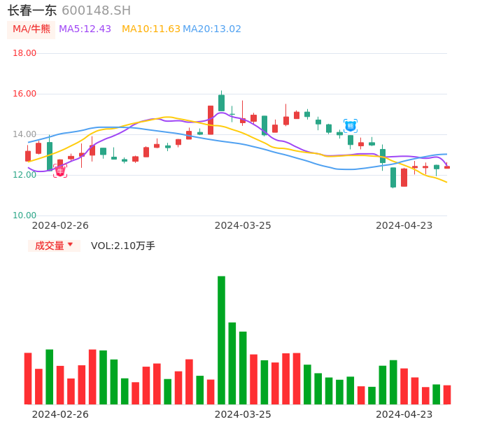 长春一东在4月10日出现日线级别熊点,虽然60分钟处于牛点区间,短期有所弱势反弹,但股价目前整体处于中期下降通道,建议在日线级别未转为牛点信号前继续谨慎观望。