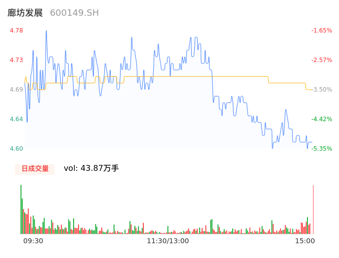 04月11日,廊坊发展收报4.61,股价涨幅-5.14%,成交金额2.06亿元,换手率11.54%。