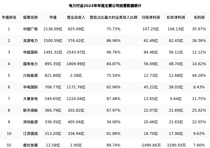 廊坊发展最新报告期数据为年报,下表汇总了电力行业内市值靠前的公司年报主要经营数据