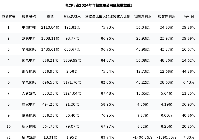 廊坊发展最新报告期数据为年报,下表汇总了电力行业内市值靠前的公司年报主要经营数据