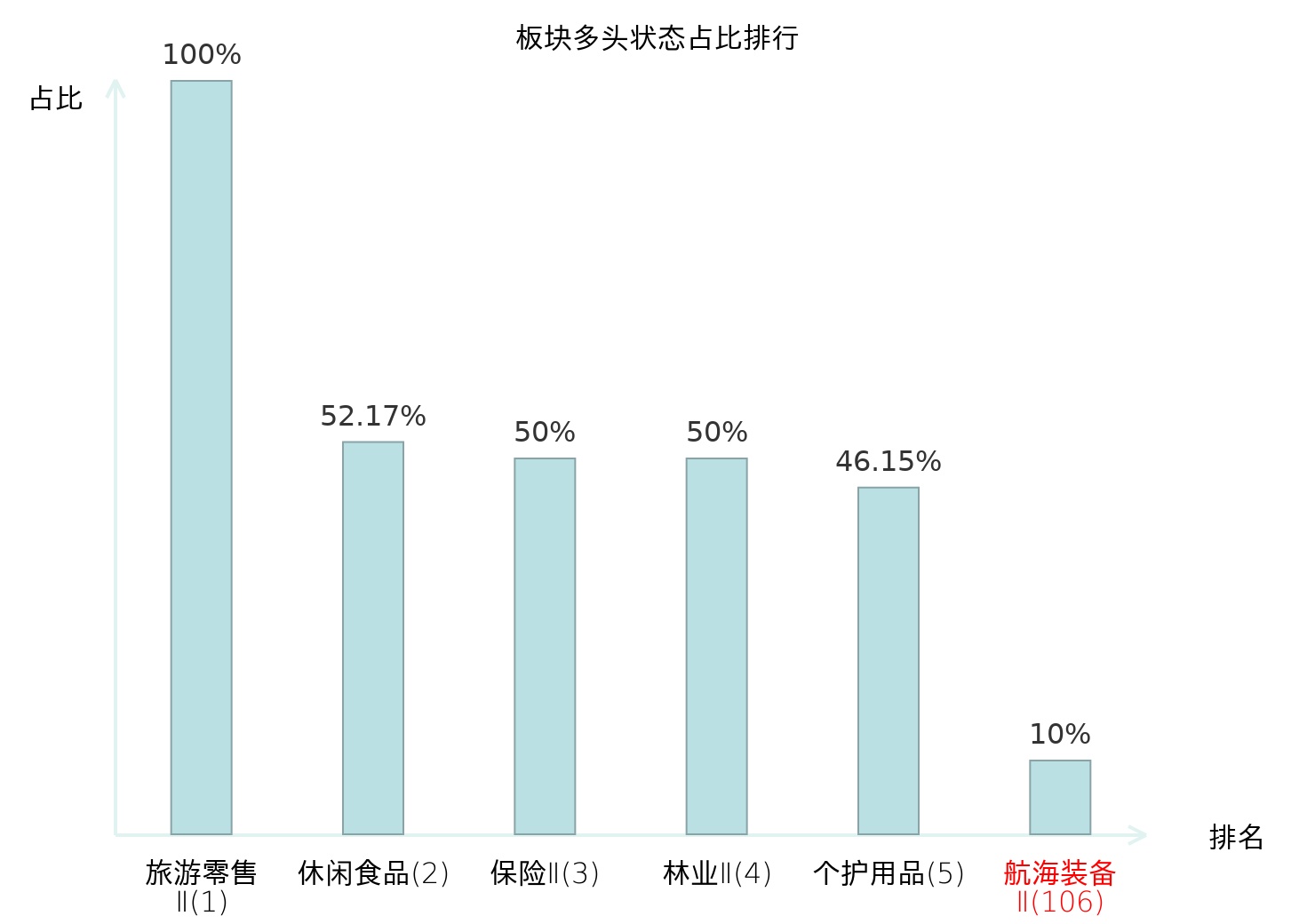 全市场所有行业板块中主力多头状态占比排名中,旅游零售Ⅱ板块位居第一。油气开采Ⅱ板块名次提升最快,较昨日上升101位。