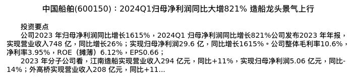 值得注意的是:2024年04月浙商证券的王华君/王洁若分析师,首次发布关于中国船舶的研究报告,标题为:中国船舶(600150):2024Q1归母净利润同比大增821% 造船龙头景气上行。