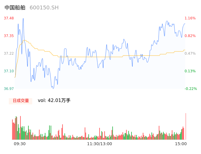 04月26日,中国船舶收报37.44,股价涨幅1.05%,成交金额15.65亿元,换手率0.94%。