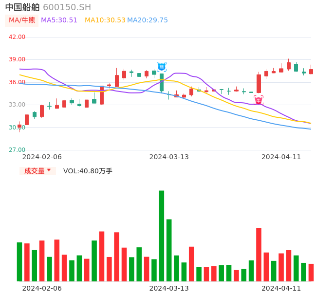 值得注意的是:2024年04月浙商证券的分析师,首次发布关于中国船舶的研究报告,标题为:中国船舶(600150):全球造船龙头 受益行业景气上行 盈利持续改善。