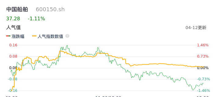 04月12日,中国船舶收报37.28,股价涨幅-1.11%,成交金额13.92亿元,换手率0.83%。
