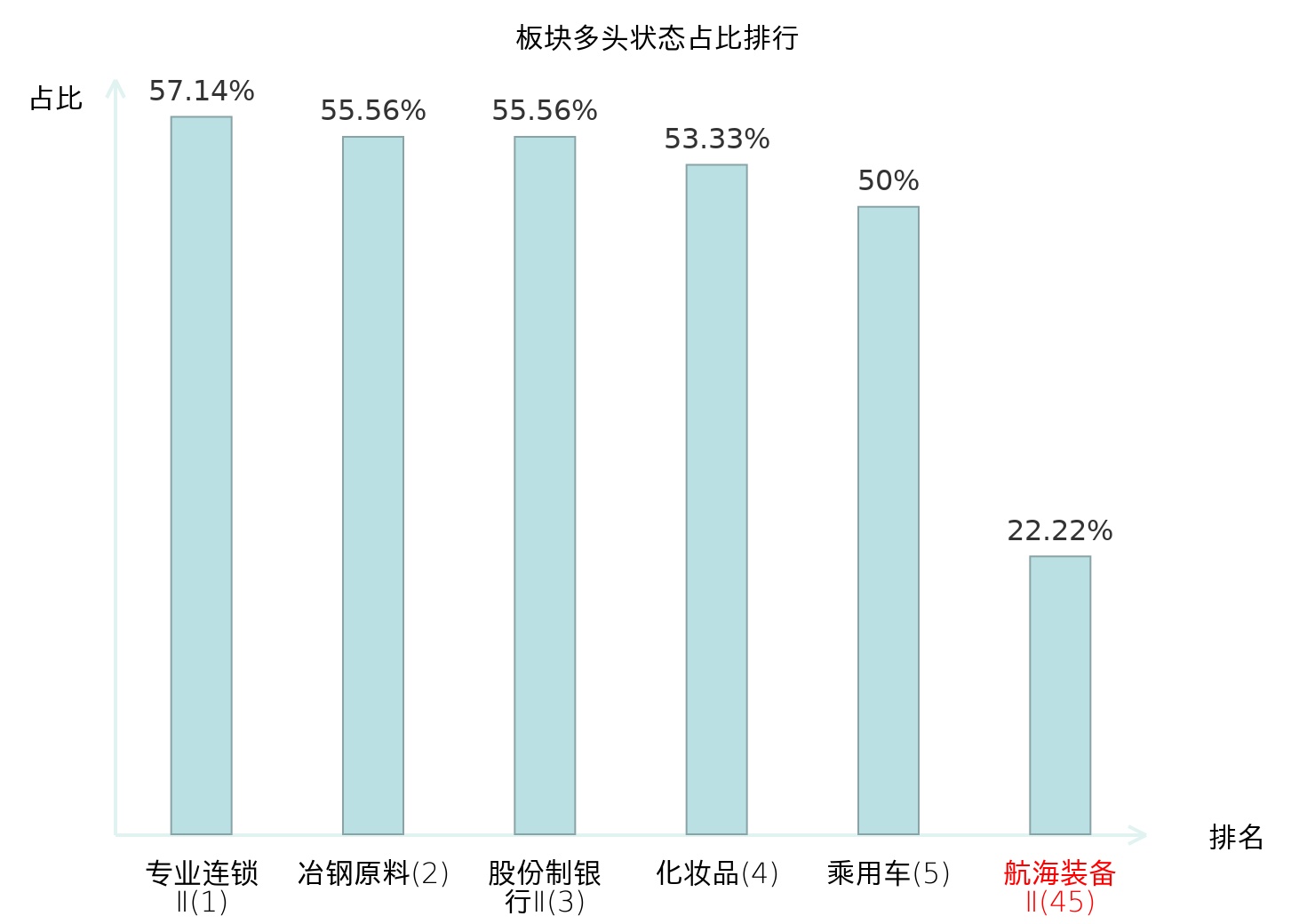 全市场所有行业板块中主力多头状态占比排名中,专业连锁Ⅱ板块位居第一。房地产服务板块名次提升最快,较昨日上升52位。