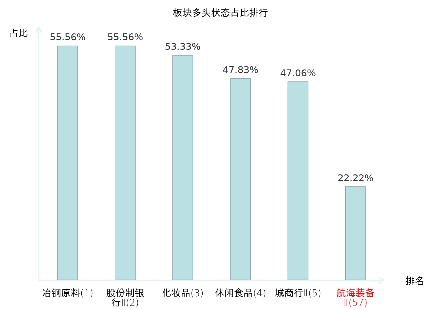 全市场所有行业板块中主力多头状态占比排名中,冶钢原料板块位居第一。其他家电Ⅱ板块名次提升最快,较昨日上升105位。