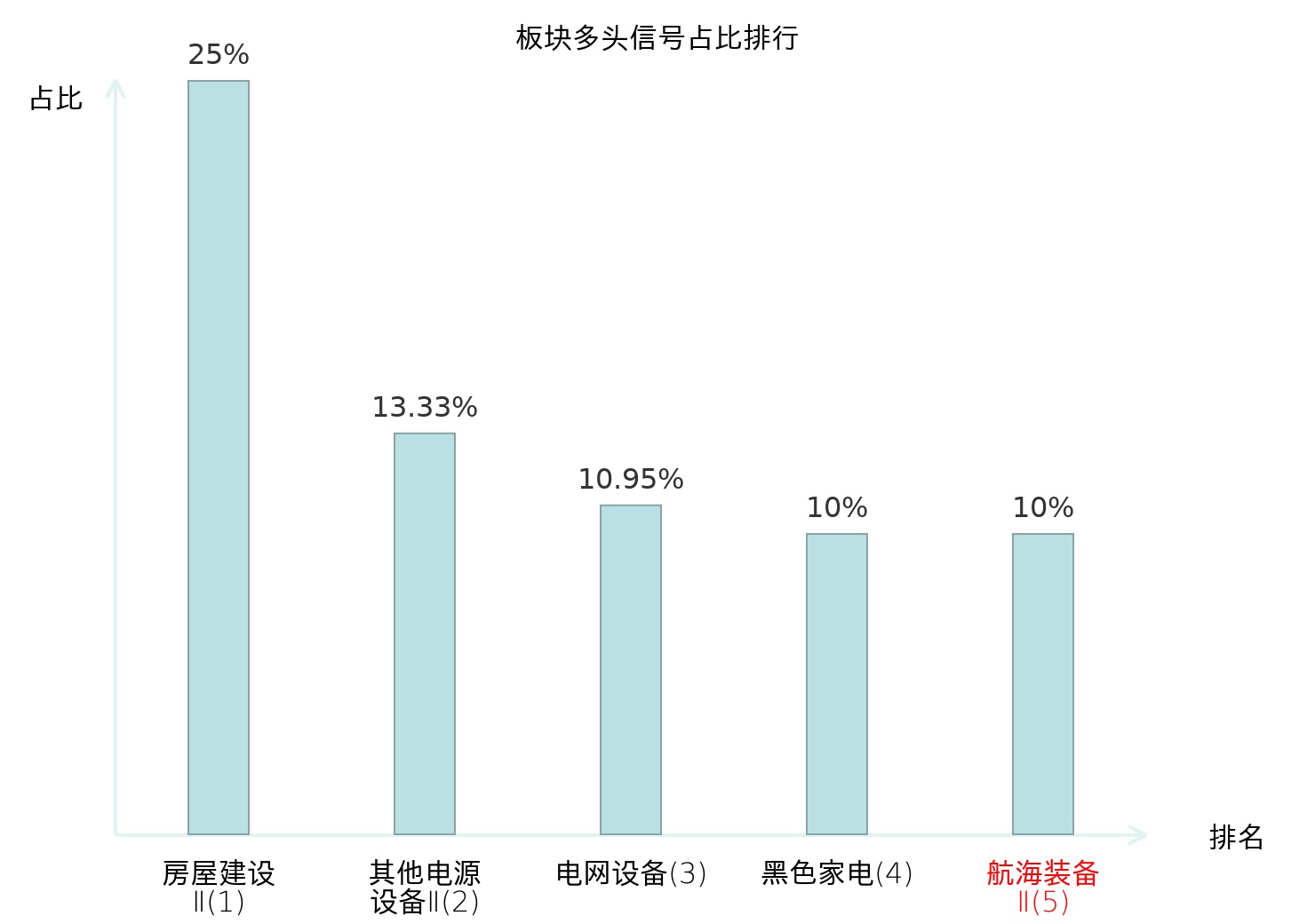 全市场所有行业板块中主力多头信号占比排名中,房屋建设Ⅱ板块位居第一。航海装备Ⅱ板块名次提升最快,较昨日上升112位。