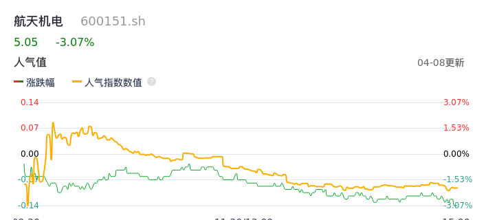 04月08日,航天机电收报5.05,股价涨幅-3.07%,成交金额7476.74万元,换手率1.02%。