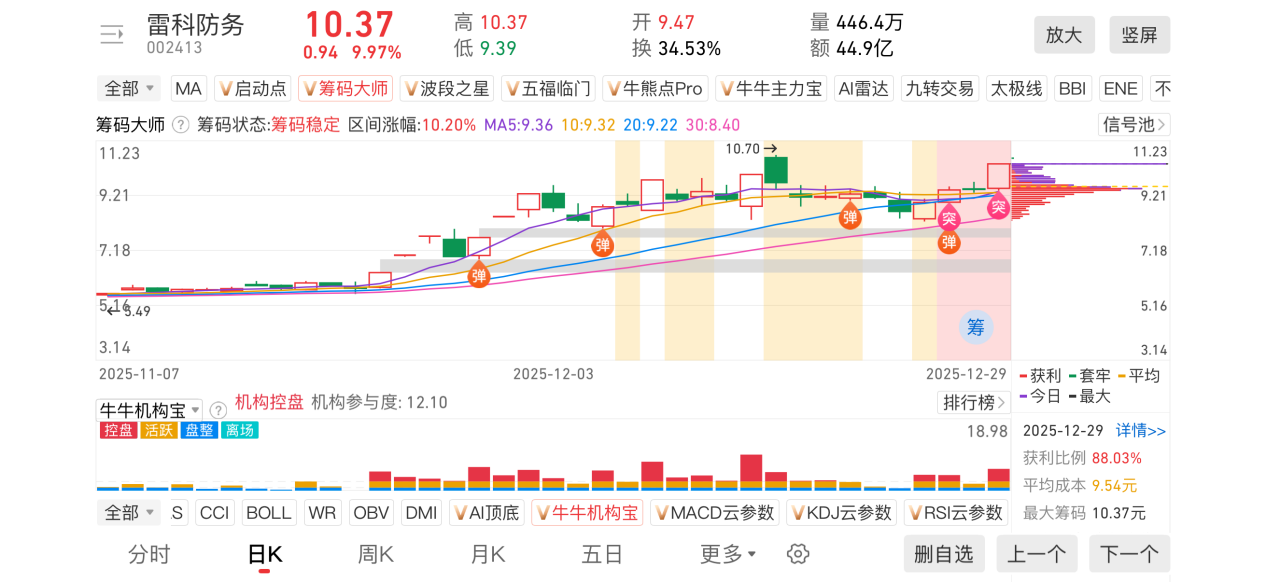 1)20251229-雷科防务-002413-【筹码大师】和【牛牛机构宝】-近期出现弹信号且底部量柱由绿转红