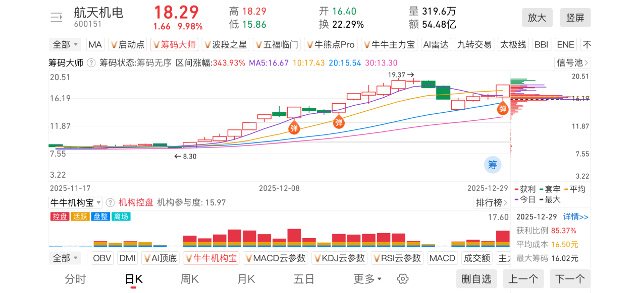 2)20251229-航天机电-600151-【筹码大师】和【牛牛机构宝】-近期出现弹信号且底部量柱由绿转红