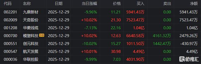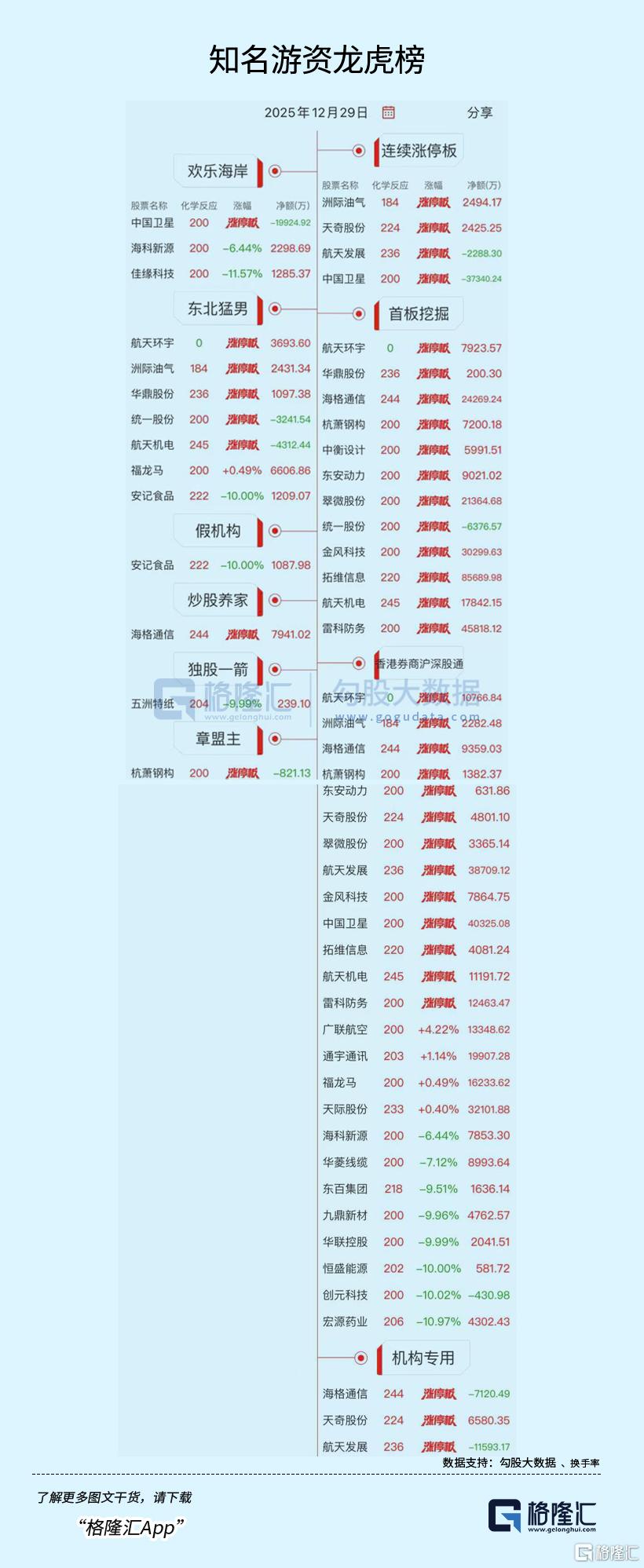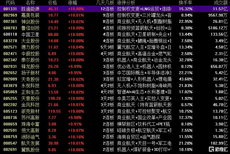 焦点股方面,实控人变更的胜通能源12连板、嘉美包装9连板、锋龙股份4连板,商业航天概念股神剑股份8连板、中国卫星4连板、鲁信创投4连板、大业股份4连板。
