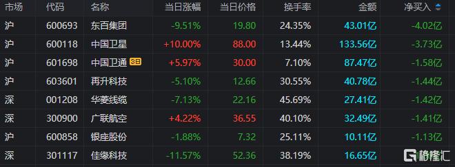 龙虎榜单日净卖出额前三为东百集团、中国卫星、再升科技,分别为4.02亿元、3.73亿元、1.44亿元。