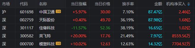 通宇通讯:上涨1.14%,换手率44.72%,成交量149.09万手,成交额65.15亿元。龙虎榜数据显示,机构合计净卖出3.14亿元,北向资金合计净买入1.99亿元。