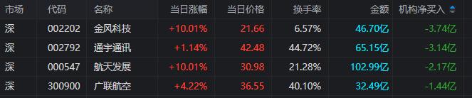 龙虎榜中涉及机构专用席位的个股中,当日净卖出额前三为金风科技、通宇通讯、航天发展,分别为3.74亿元、3.14亿元、2.17亿元。