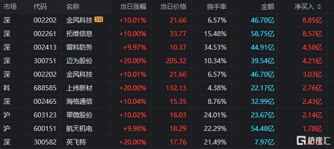 龙虎榜单日净买入额前三为拓维信息、雷科防务、迈为股份,分别为8.57亿元、4.58亿元、4.21亿元。