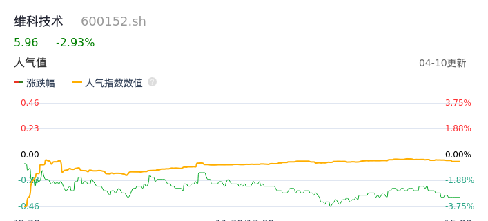 04月10日,维科技术收报5.96,股价涨幅-2.93%,成交金额8616.10万元,换手率2.71%。