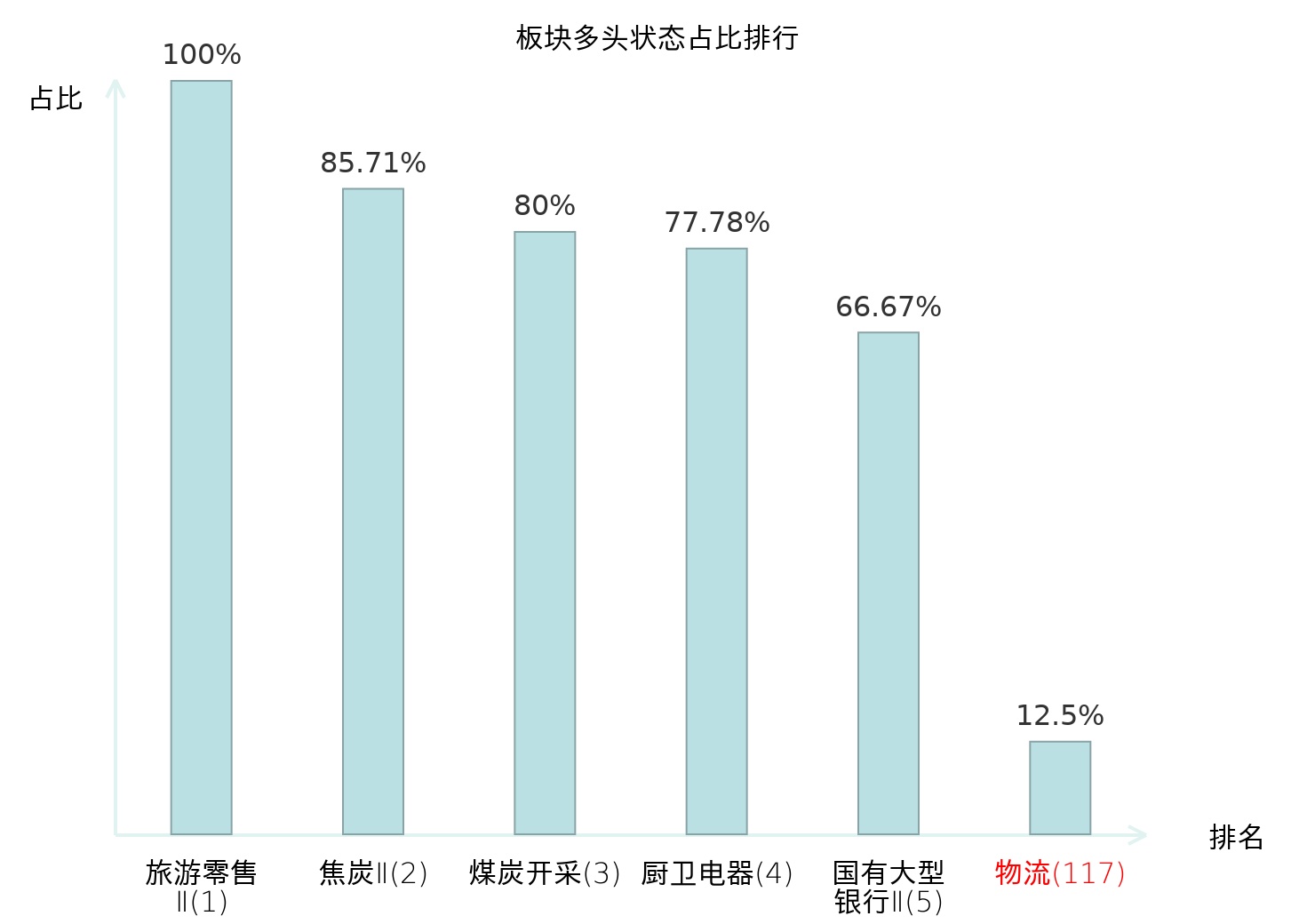 全市场所有行业板块中主力多头状态占比排名中,旅游零售Ⅱ板块位居第一。渔业板块名次提升最快,较昨日上升66位。