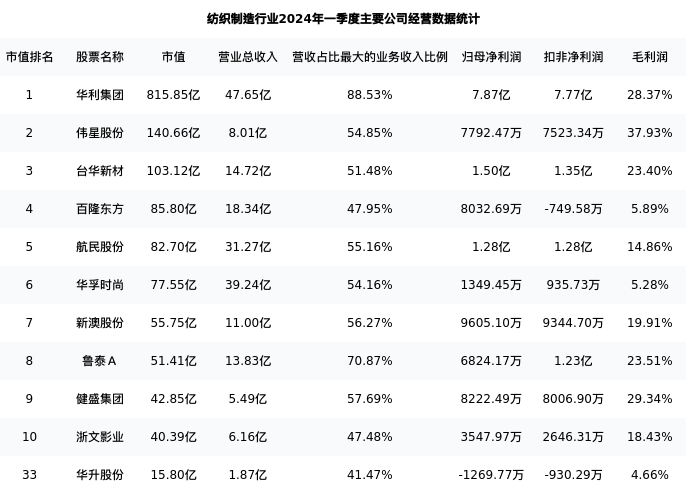 华升股份最新报告期数据为一季度,下表汇总了纺织制造行业内市值靠前的公司一季度主要经营数据