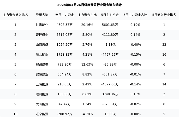 从主力资金流向来看,煤炭开采行业今日主力资金流入34.25亿元,在所有申万二级行业中排名:31/131。