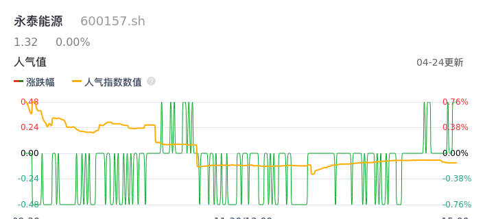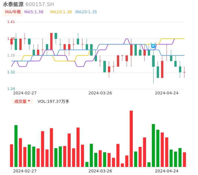 04月24日,永泰能源收报1.32,股价涨幅0.00%,成交金额2.60亿元,换手率0.89%。
