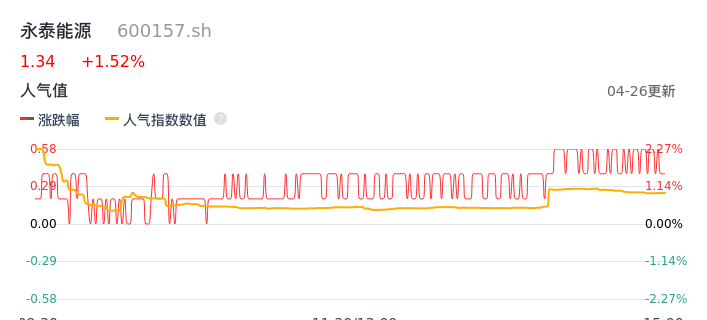 04月26日,永泰能源收报1.34,股价涨幅1.52%,成交金额4.72亿元,换手率1.59%。