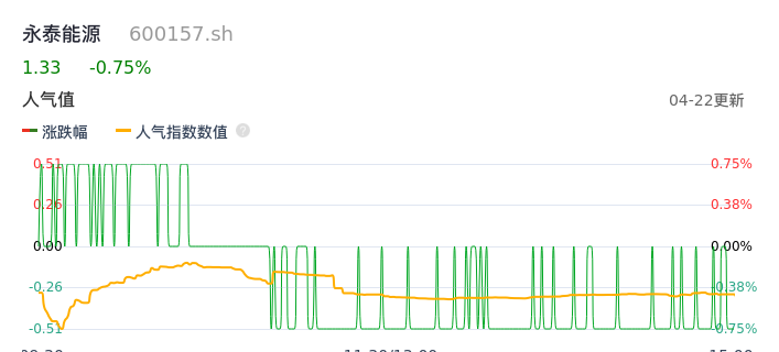 04月22日,永泰能源收报1.33,股价涨幅-0.75%,成交金额2.70亿元,换手率0.91%。