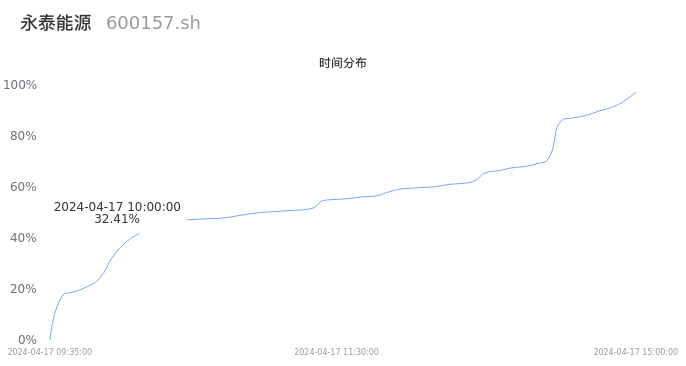 600157永泰能源2024年04月17日成交329.18万手,成交金额4.39亿元,相较昨日缩量18.41万手,换手率1.48%,成交清淡。