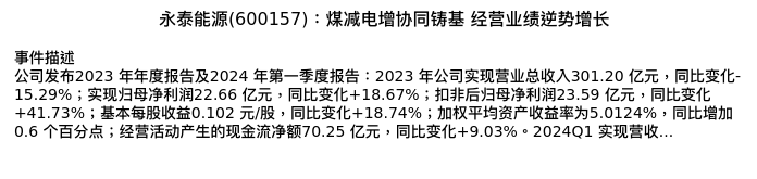 值得注意的是:2024年04月山西证券的胡博/刘贵军分析师,首次发布关于永泰能源的研究报告,标题为:永泰能源(600157):煤减电增协同铸基 经营业绩逆势增长。