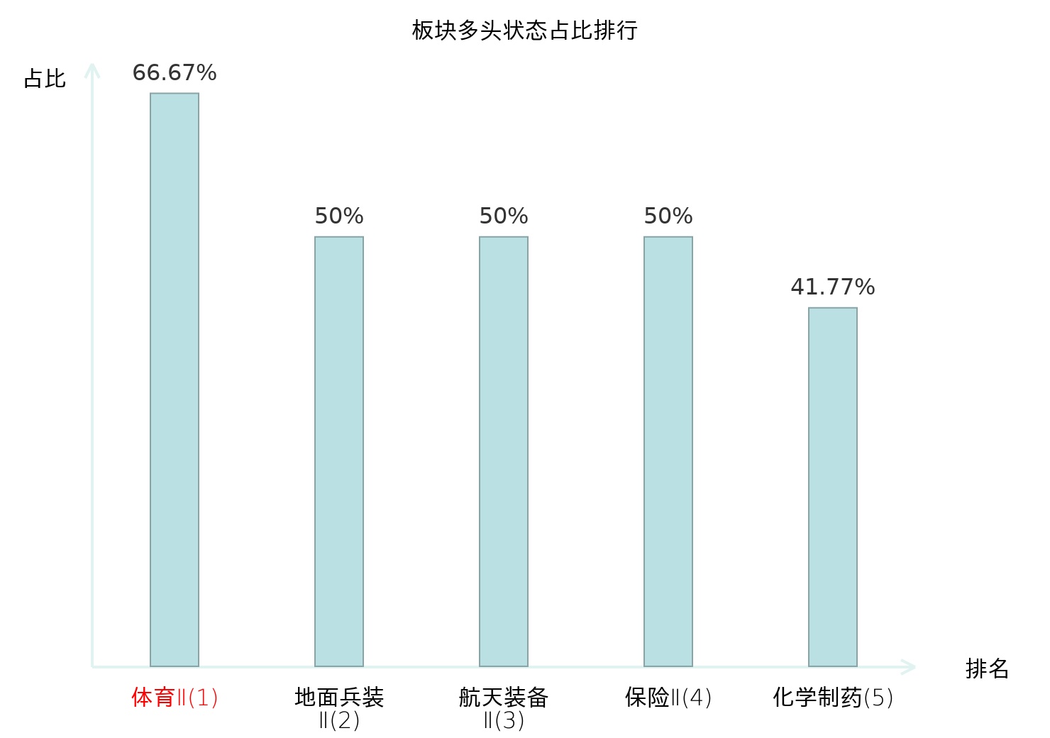 全市场所有行业板块中主力多头状态占比排名中,体育Ⅱ板块位居第一。普钢板块名次提升最快,较昨日上升98位。