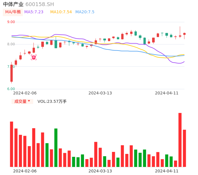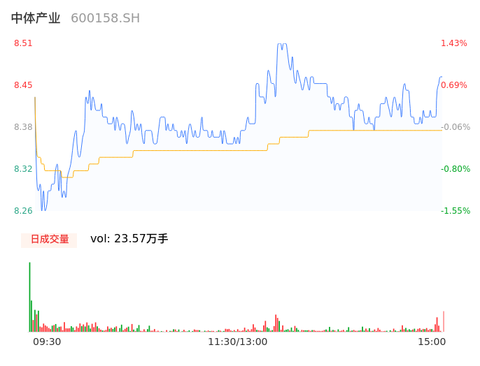 04月11日,中体产业收报8.50,股价涨幅1.31%,成交金额1.98亿元,换手率2.46%。