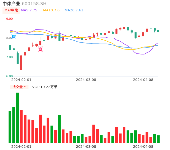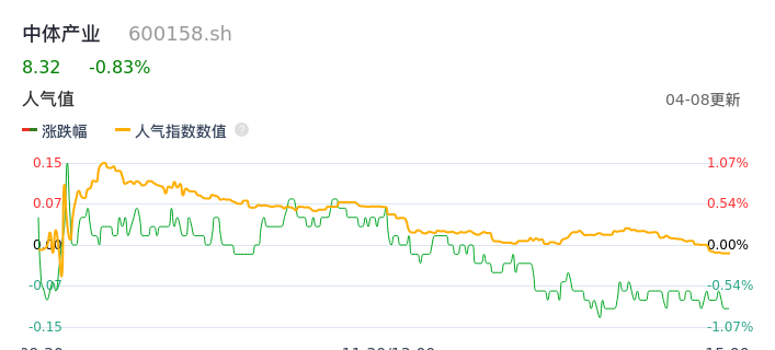 04月08日,中体产业收报8.32,股价涨幅-0.83%,成交金额8573.59万元,换手率1.07%。