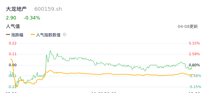 04月08日,大龙地产收报2.90,股价涨幅-0.34%,成交金额1.57亿元,换手率6.53%。