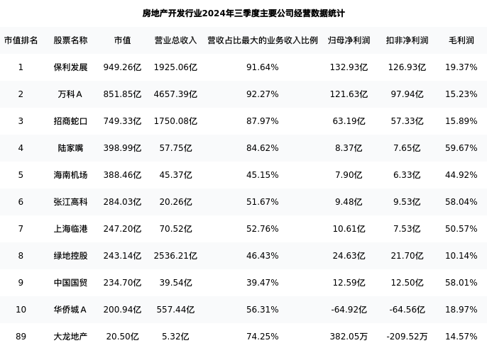 大龙地产最新报告期数据为三季度,下表汇总了房地产开发行业内市值靠前的公司三季度主要经营数据