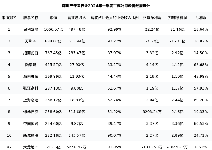 大龙地产最新报告期数据为一季度,下表汇总了房地产开发行业内市值靠前的公司一季度主要经营数据
