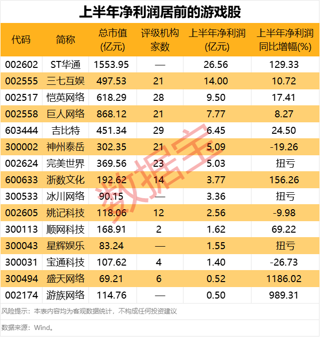 从上半年净利润变动看,上述个股中,盛天网络、游族网络、浙数文化、ST华通净利润同比增幅依次为1186.02%、989.31%、156.26%、129.33%;完美世界、冰川网络、星辉娱乐同比实现扭亏为盈。