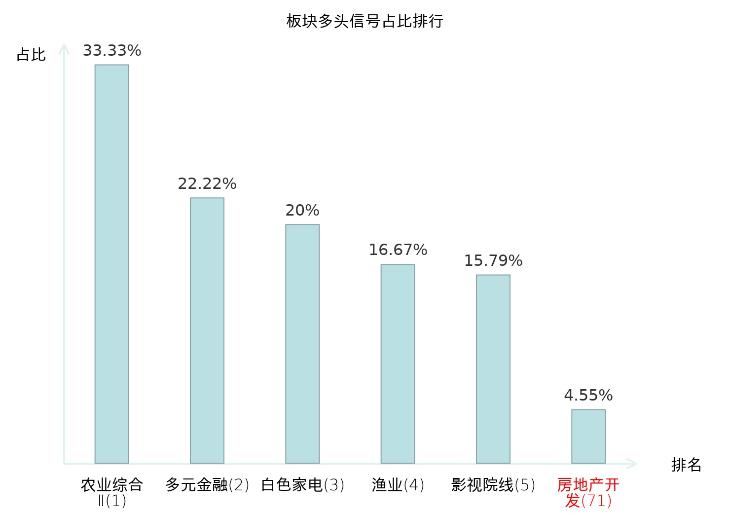 全市场所有行业板块中主力多头信号占比排名中,农业综合Ⅱ板块位居第一。农业综合Ⅱ板块名次提升最快,较昨日上升127位。