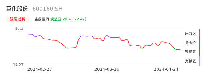04月24日,巨化股份收报22.00,股价涨幅0.64%,成交金额5.45亿元,换手率0.92%。