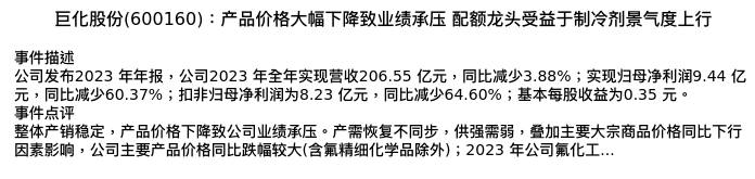 值得注意的是:2024年04月山西证券的分析师,首次发布关于巨化股份的研究报告,标题为:巨化股份(600160):产品价格大幅下降致业绩承压 配额龙头受益于制冷剂景气度上行。