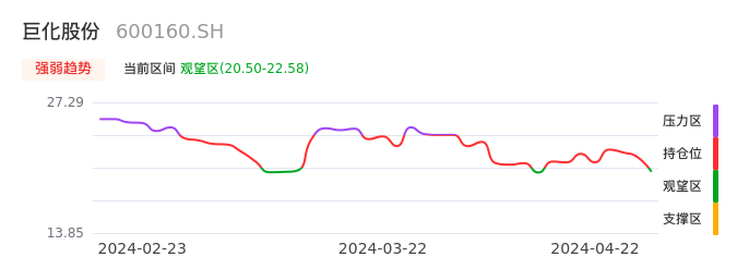 04月22日,巨化股份收报22.32,股价涨幅-4.12%,成交金额8.03亿元,换手率1.31%。
