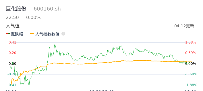 04月12日,巨化股份收报22.50,股价涨幅0.00%,成交金额6.05亿元,换手率1.00%。