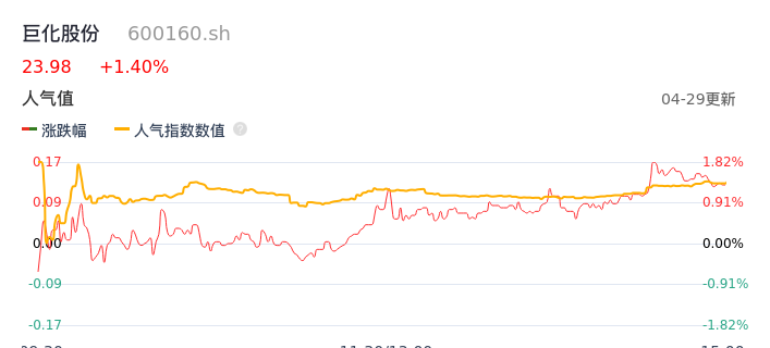 04月29日,巨化股份收报23.98,股价涨幅1.40%,成交金额10.18亿元,换手率1.59%。