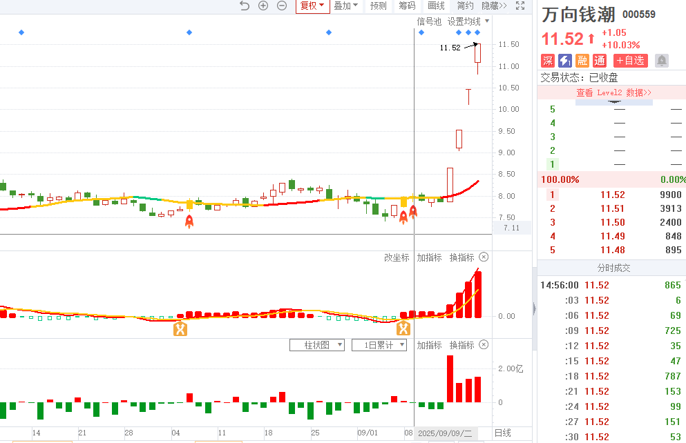 2)20250909-万向钱潮-四维操盘-近期出现火箭信号且底部量柱由绿转红