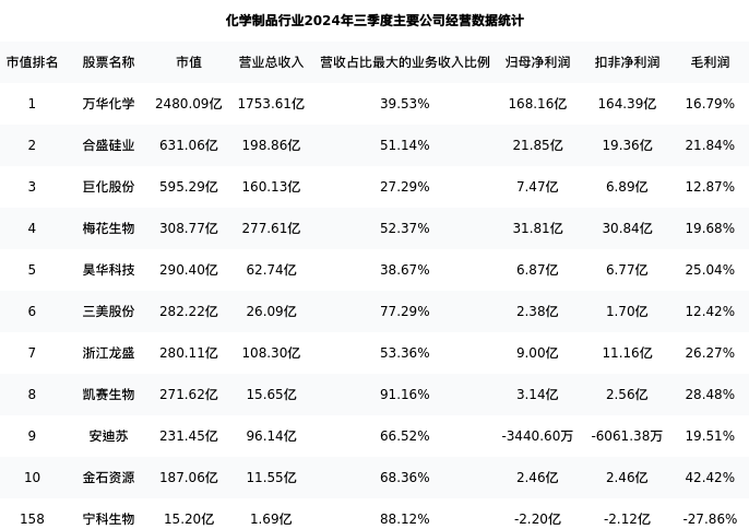 宁科生物最新报告期数据为三季度,下表汇总了化学制品行业内市值靠前的公司三季度主要经营数据