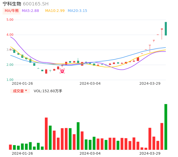 03月29日,宁科生物收报3.96,股价涨幅-10.00%,成交金额6.63亿元,换手率22.28%。