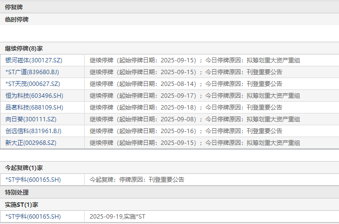 上证报中国证券网讯 9月19日,1家公司复牌:*ST宁科。