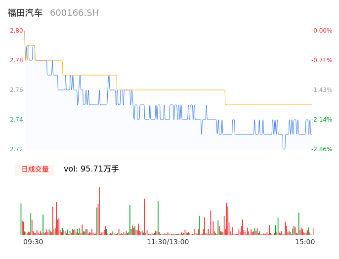 04月03日,福田汽车收报2.73,股价涨幅-2.50%,成交金额2.63亿元,换手率1.46%。