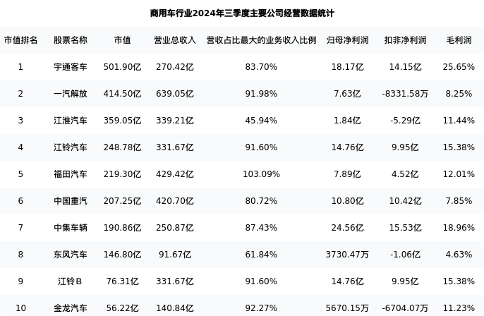 福田汽车最新报告期数据为三季度,下表汇总了商用车行业内市值靠前的公司三季度主要经营数据