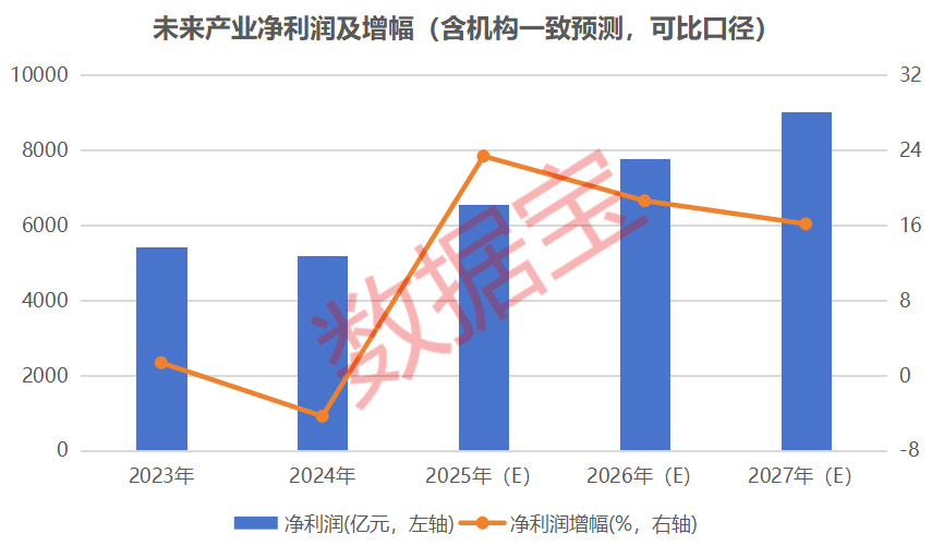 未来产业展现出了强大的增长动能。据证券时报·数据宝统计,上文提及的7个未来产业共涉及381家公司,这些公司2023年、2024年净利润整体增幅(可比口径,下同)偏弱,且2024年净利润略有下降,结合机构一致预测的净利润中值来看,2025年这些公司整体净利润中值超过6500亿元(不含未获机构预测的公司),同比增幅有望超过20%,2026年、2027年整体净利润增幅均有望超过15%。