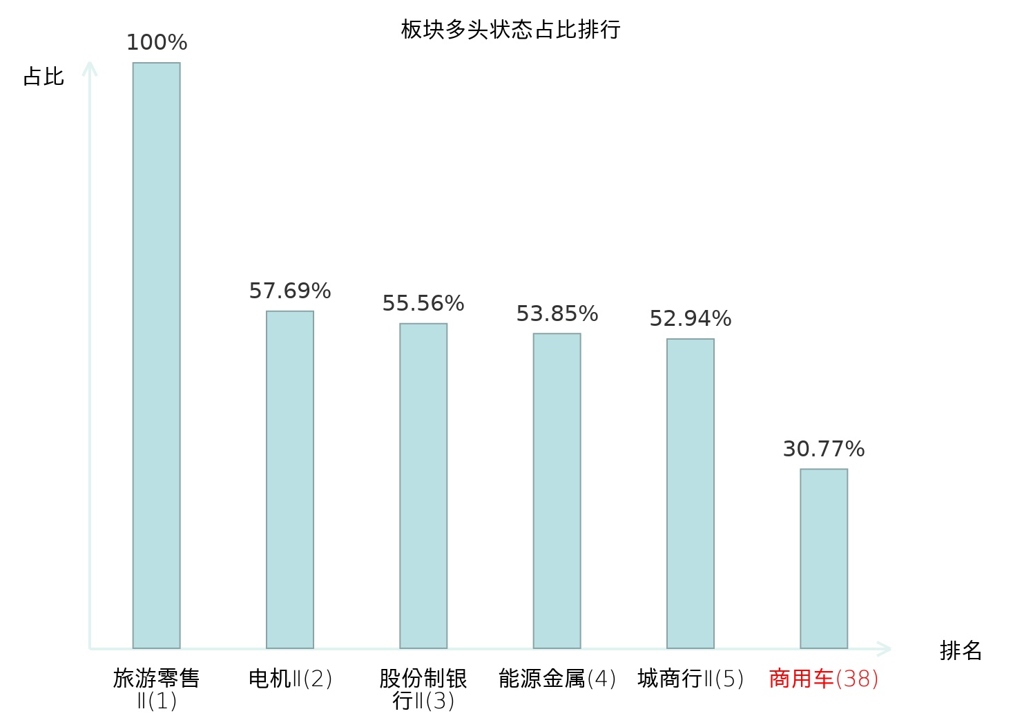 全市场所有行业板块中主力多头状态占比排名中,旅游零售Ⅱ板块位居第一。地面兵装Ⅱ板块名次提升最快,较昨日上升99位。